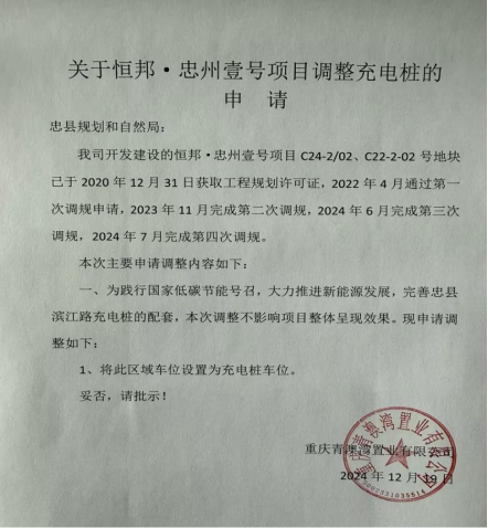 修改内容: 为践行国家低碳节能号召,大力推进新能源发展,完善忠县滨江路充电桩的配套。将项目最南侧的地面停车位升级成为集中充电车位,并配备快充充电柱,进一步提升效率和体验感,本次调整不影响项目整体呈现效果。